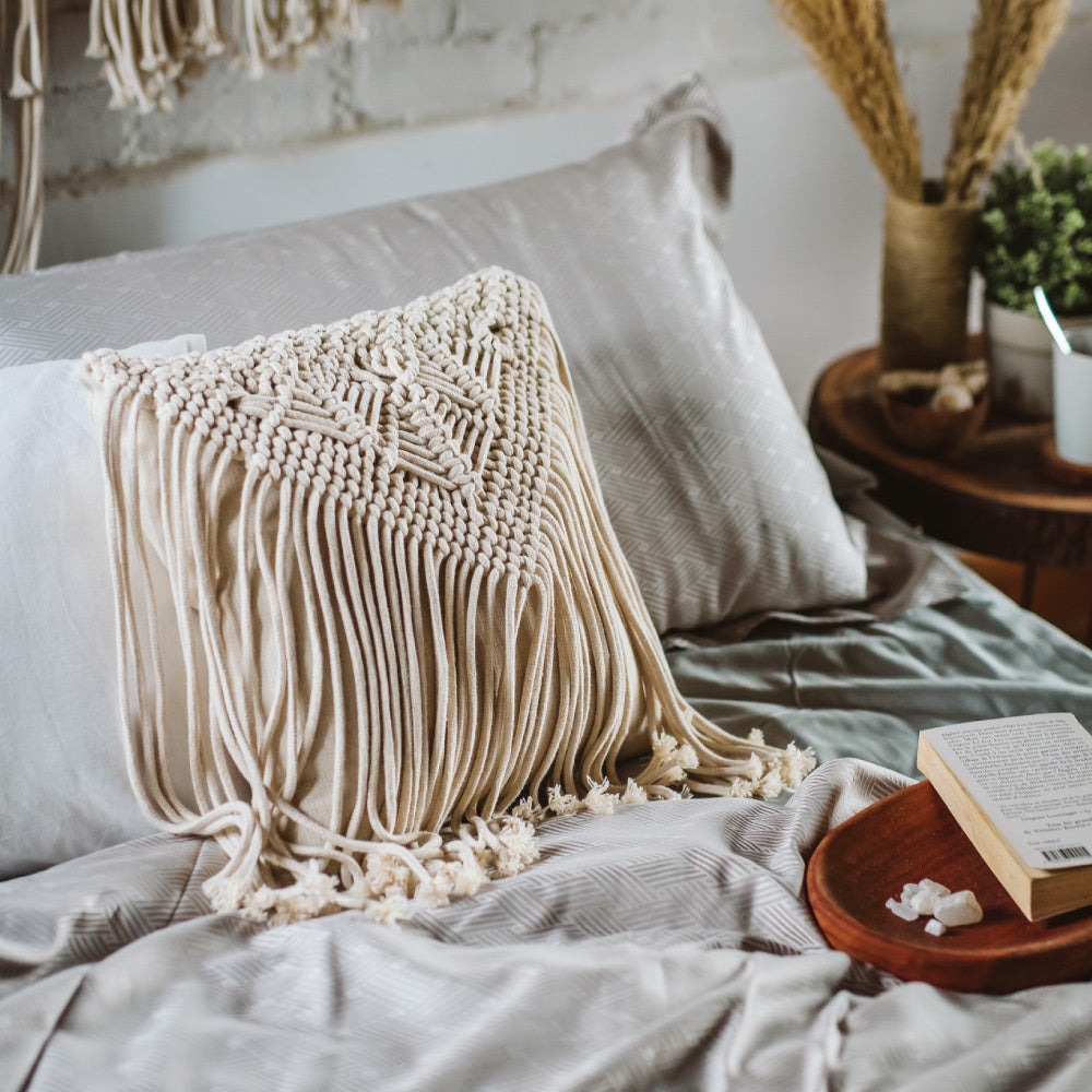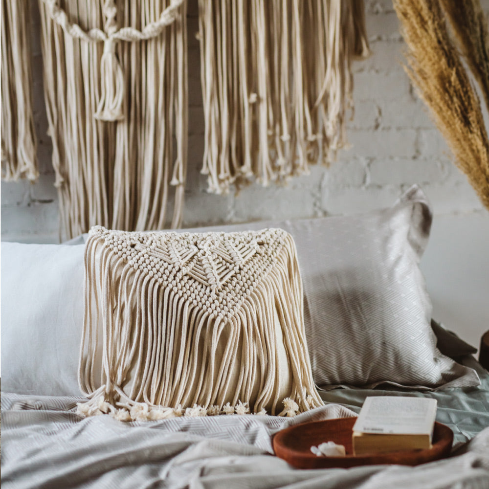نقدم لك وسادة مكرمية مزينة بالشرايب لمظهر أنيق وجذاب. فهي مصممة لمحبي الأجواء البوهيمية بالمنزل.