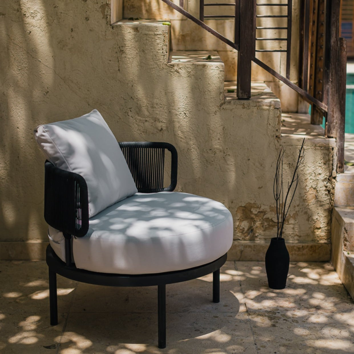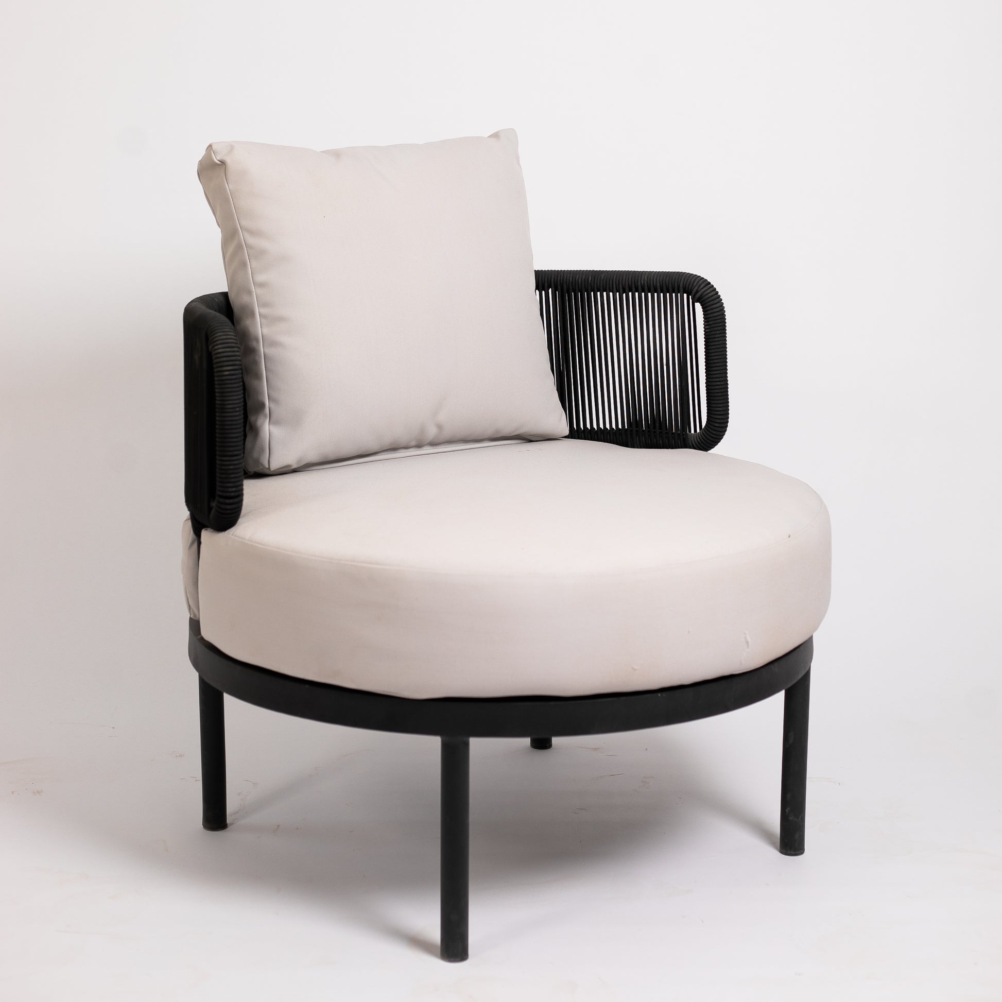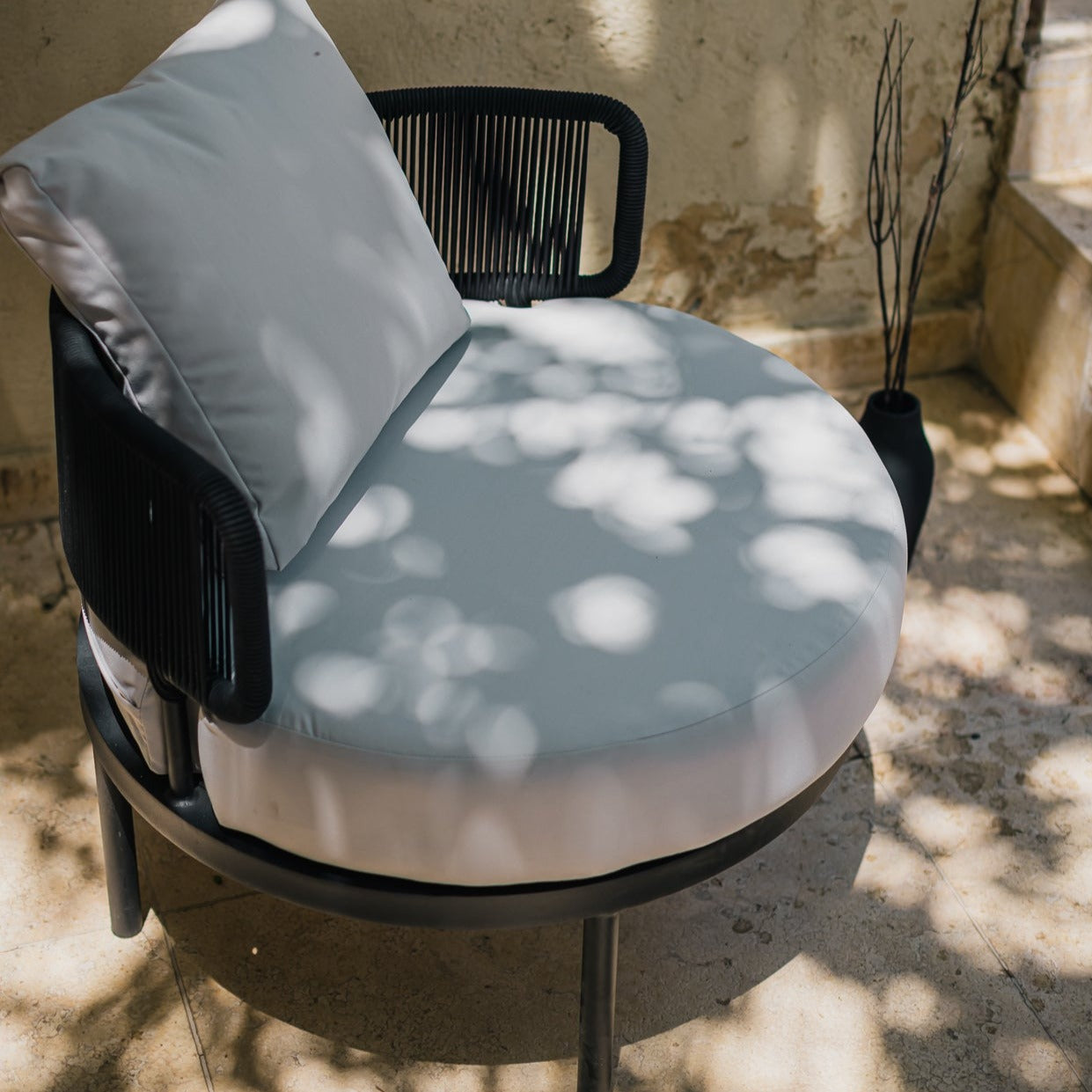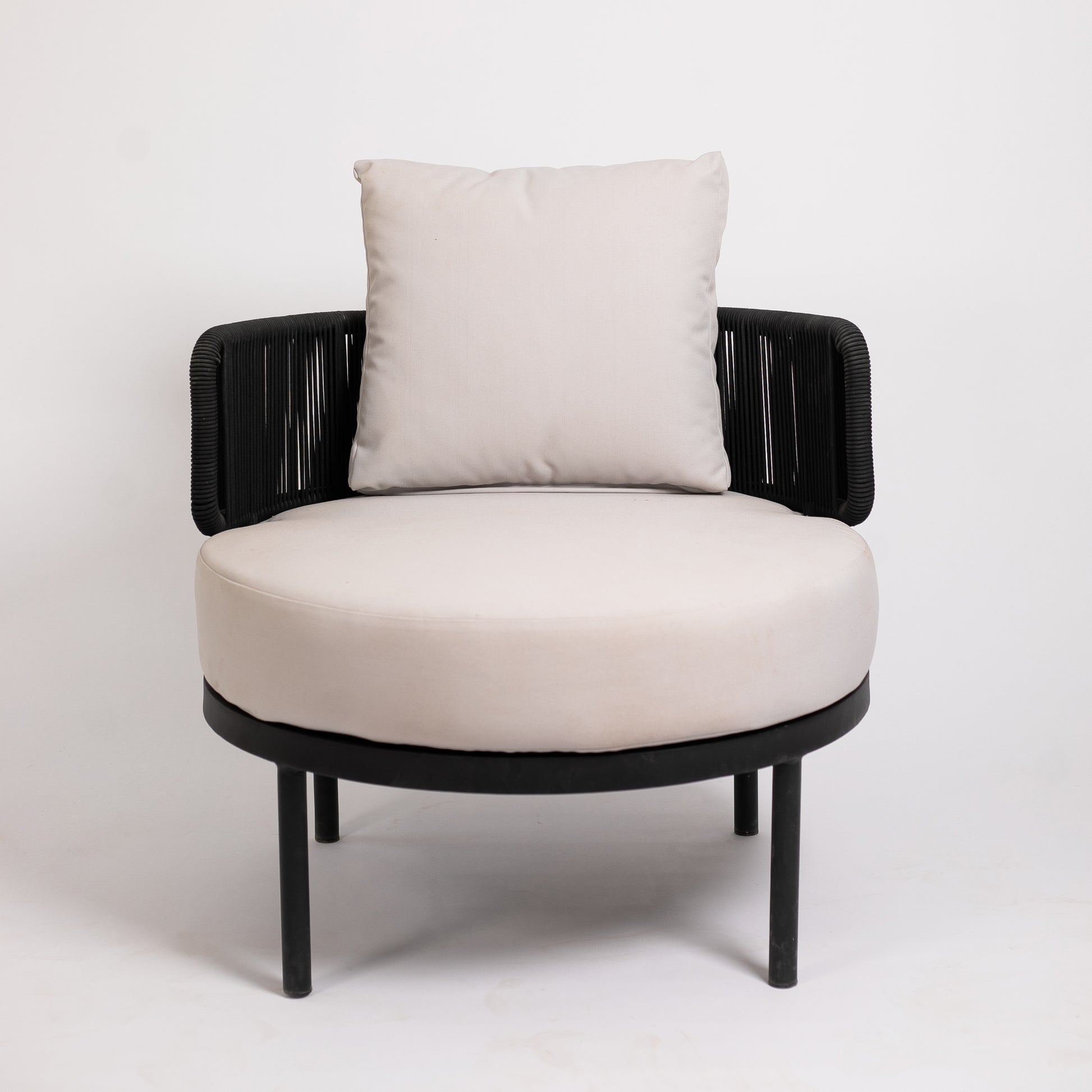 نقدم لك كرسي فوتيه دائري بحبال، مصنوع من الألومنيوم المتين والأنيق وطبقة دهان إليكتروستاتيك مما يجعله مثاليًا للحديقة أو المساحات الخارجية. هذا الكرسي أساسي إذا كنت تبحث عن مكان مريح لقراءة كتاب أو للاسترخاء تحت أشعة الشمس.