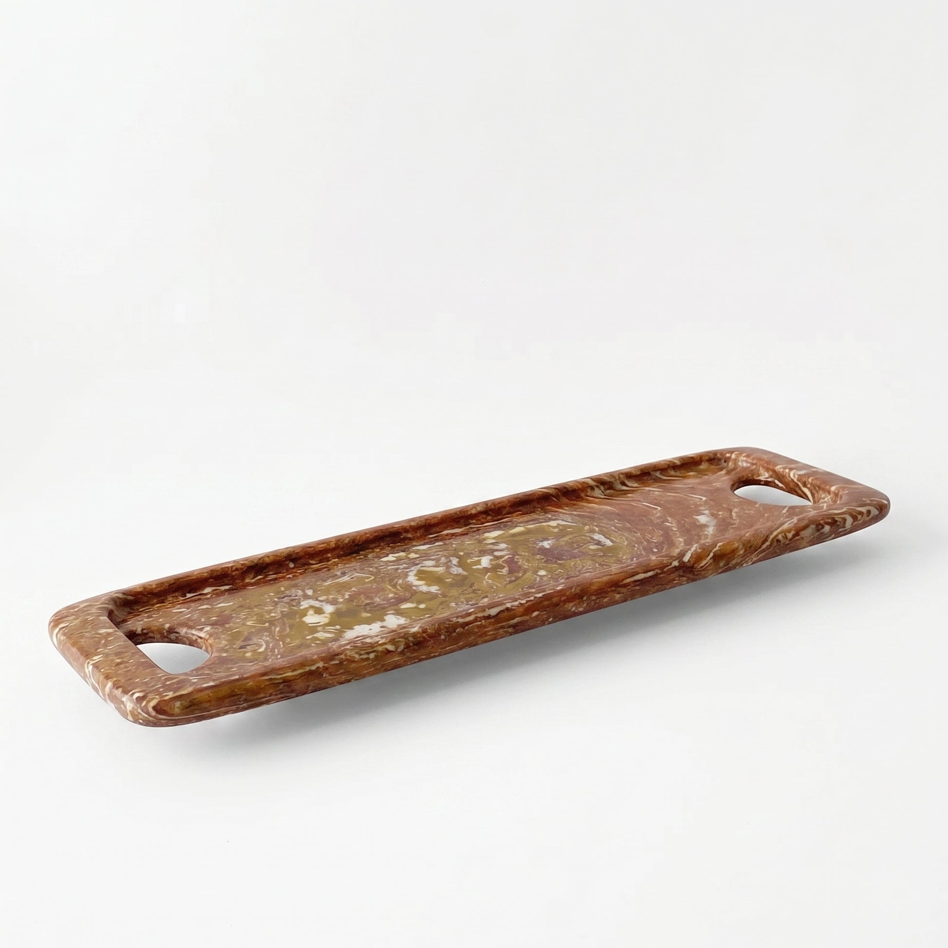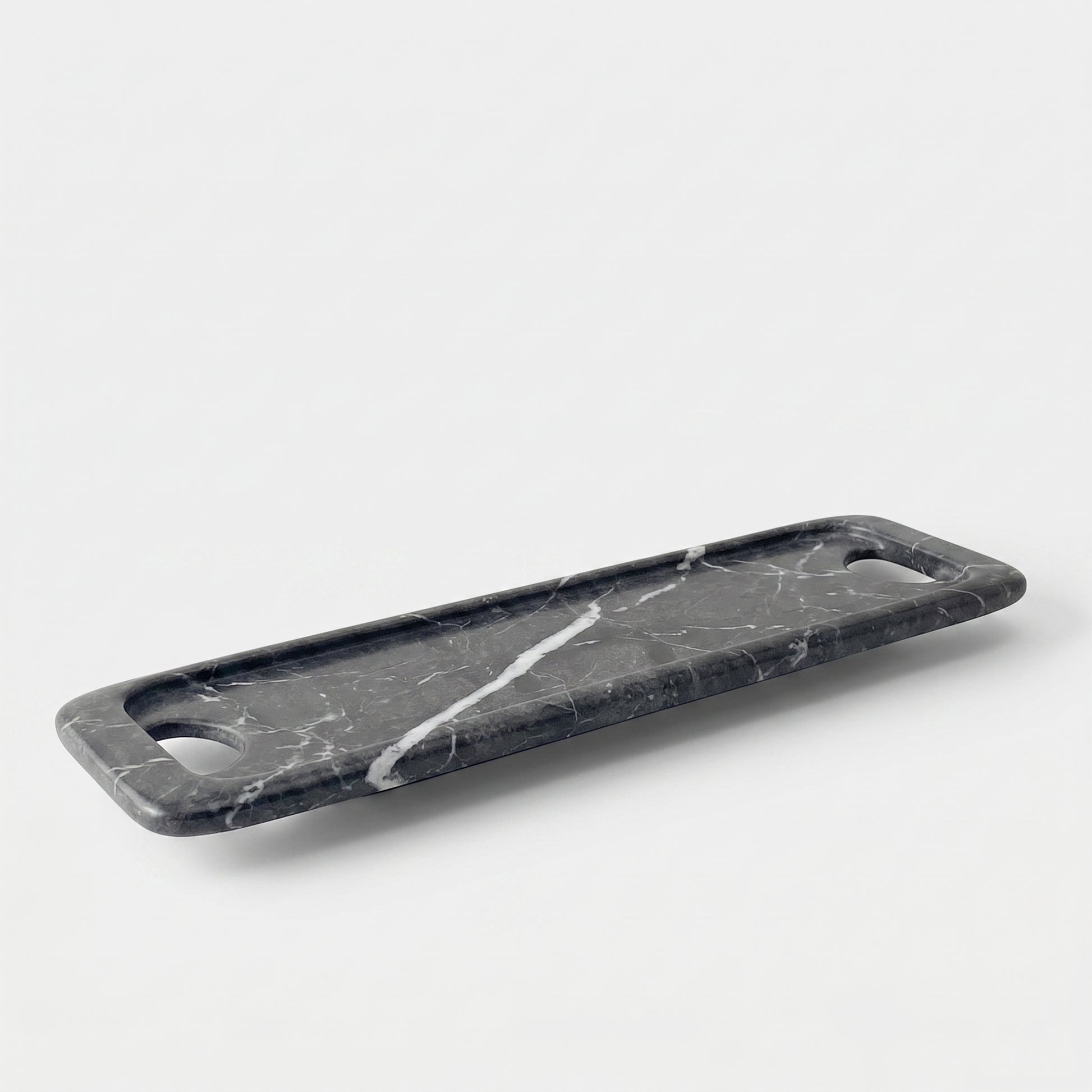 A masterpiece of elongated design and natural luxury. Carved from a premium marble, this slim utility tray features integrated circular handles and soft, rounded edges, making it a sophisticated accent for narrow surfaces and modern interiors.