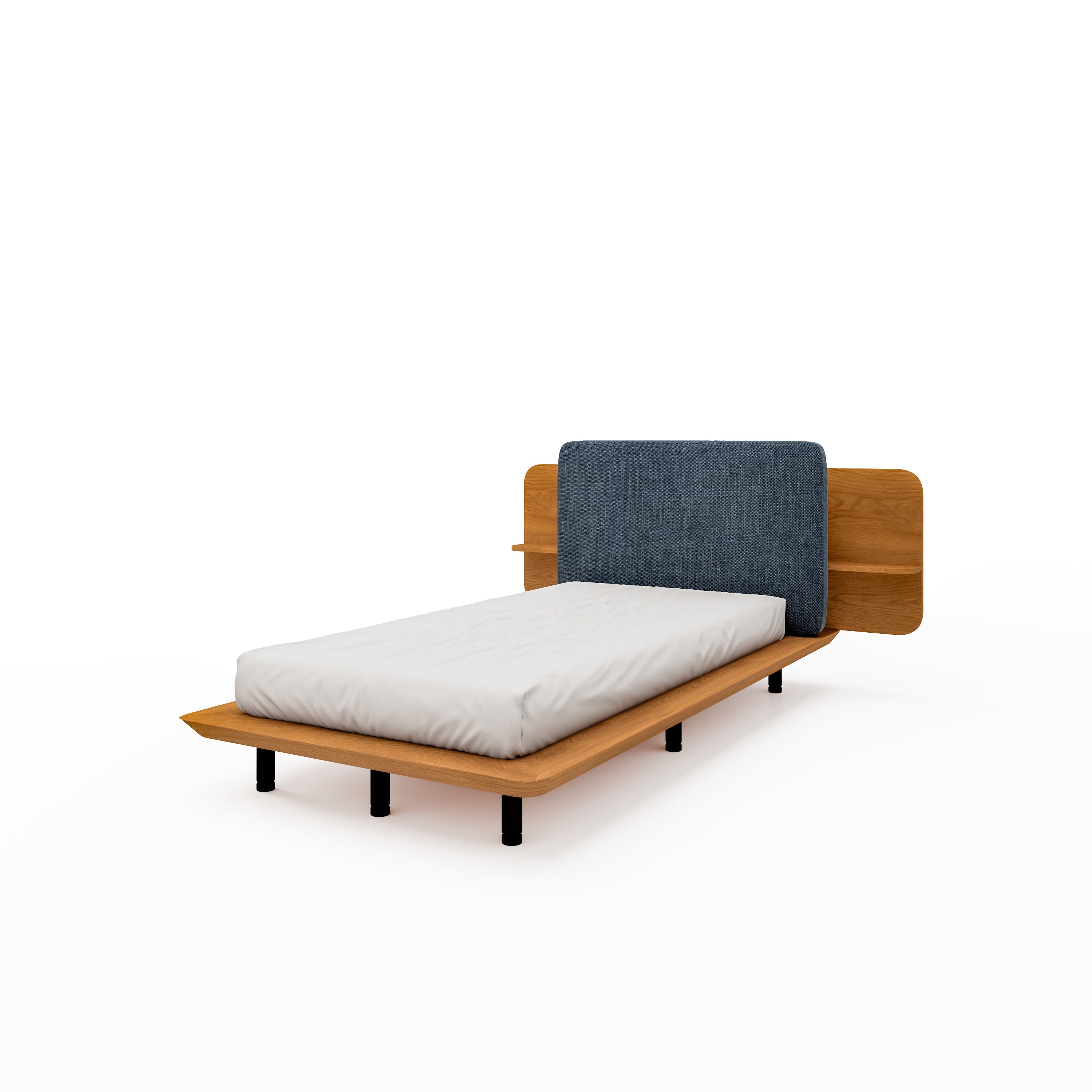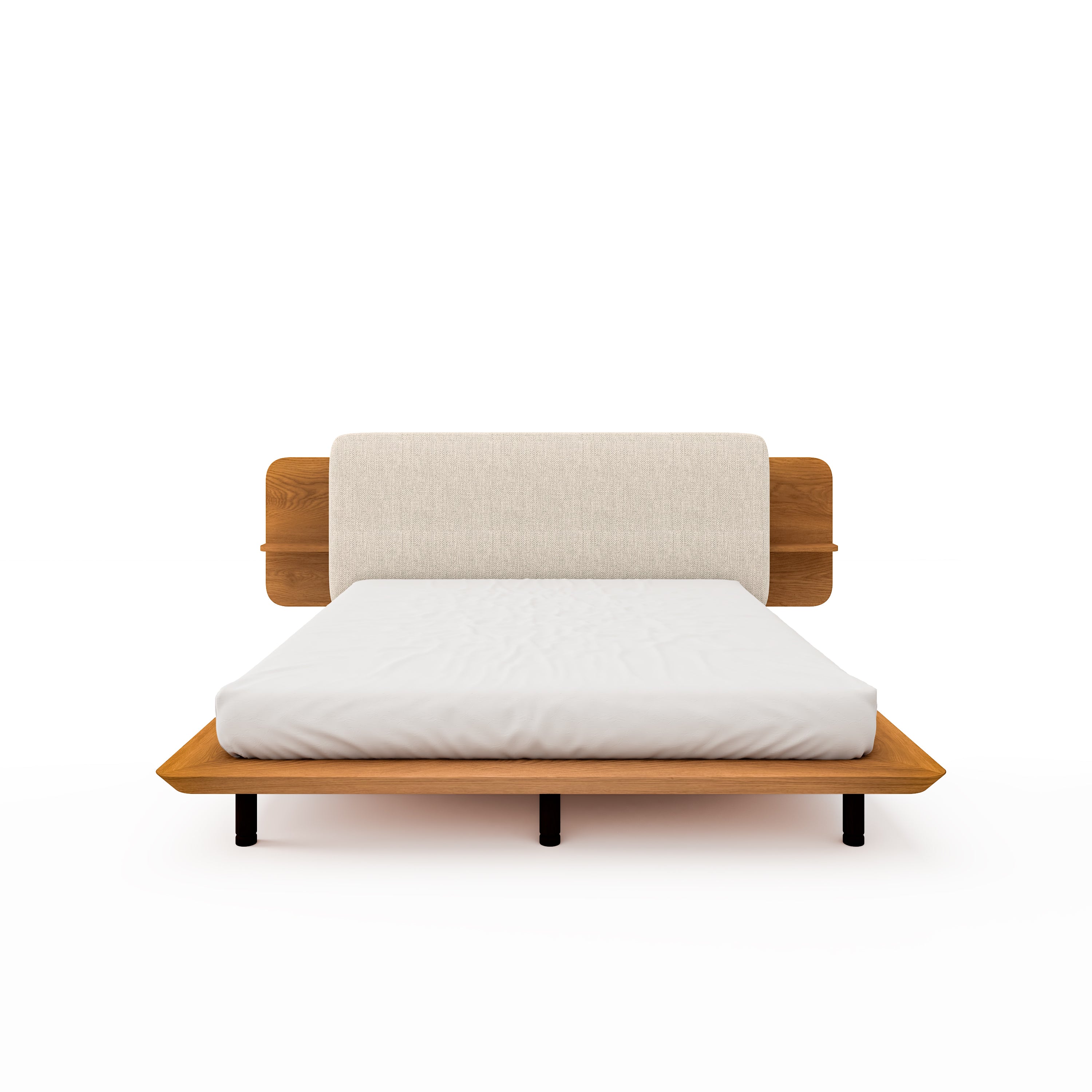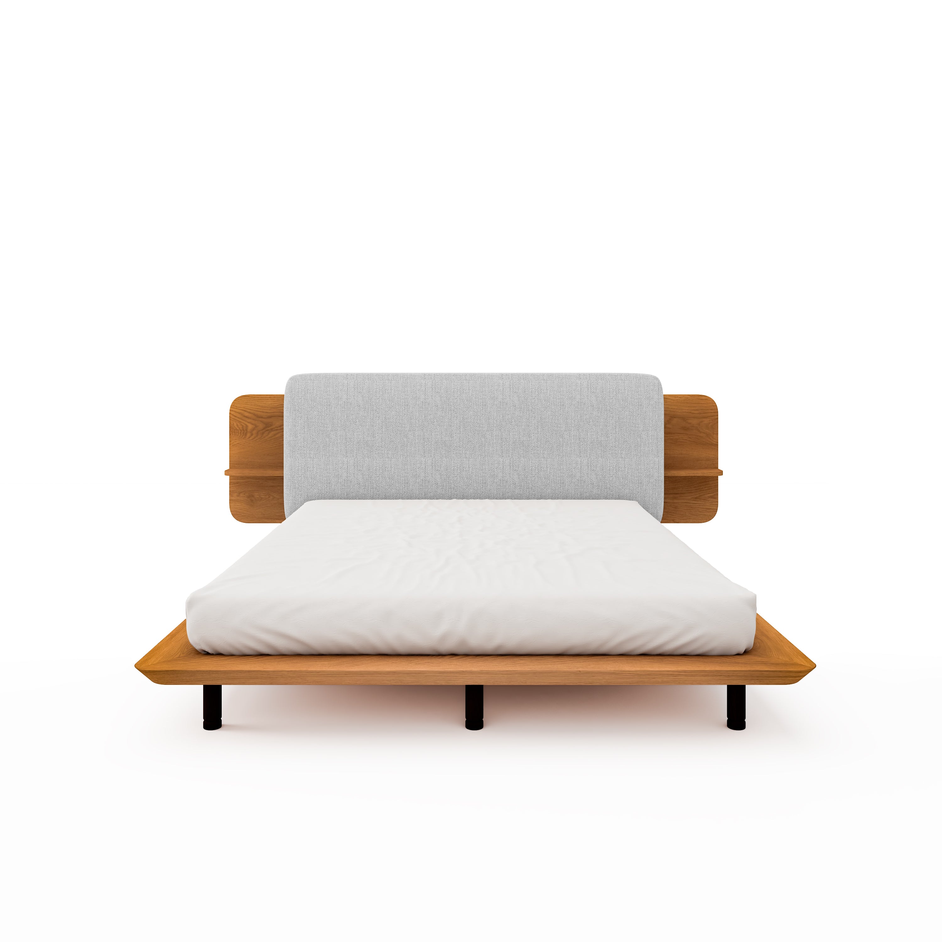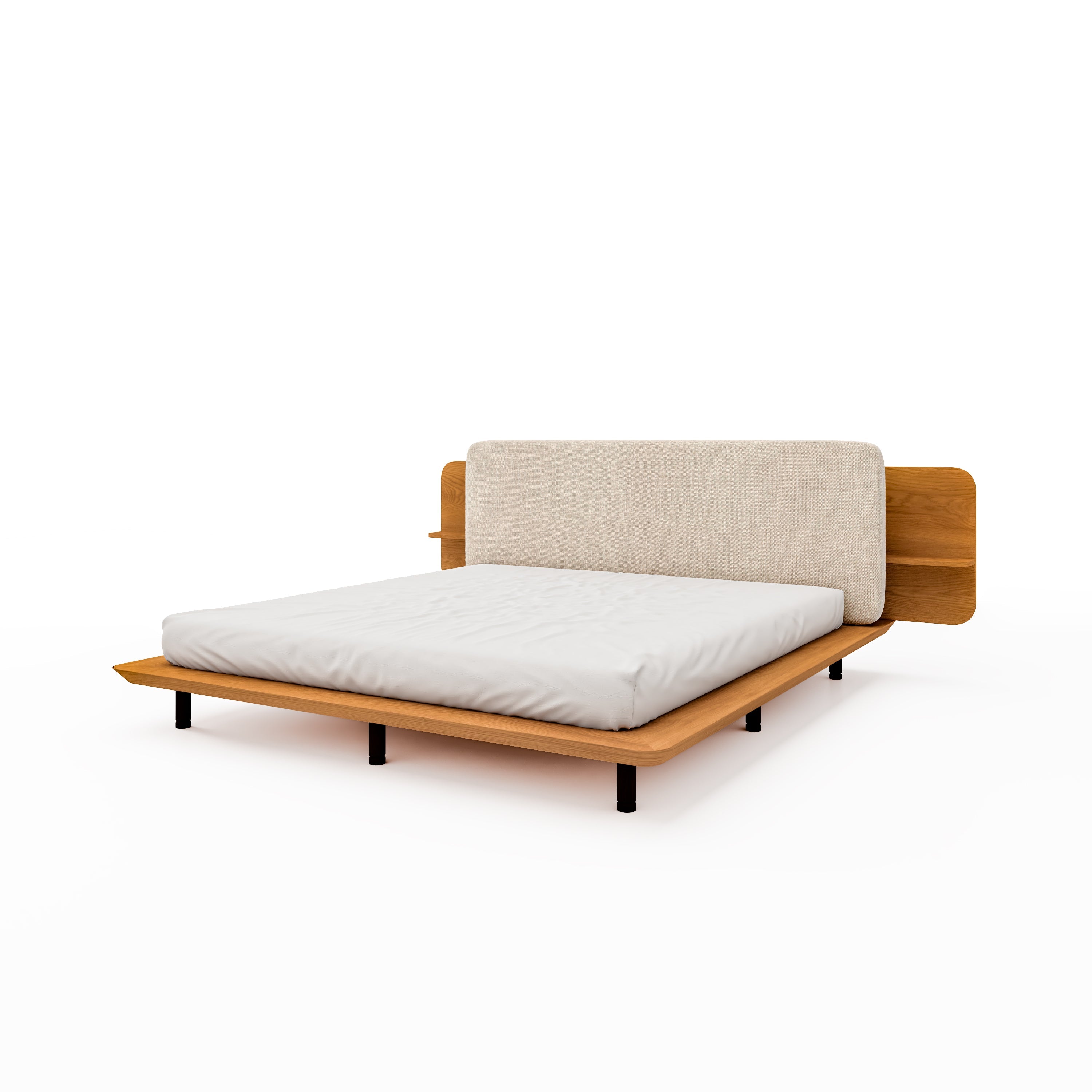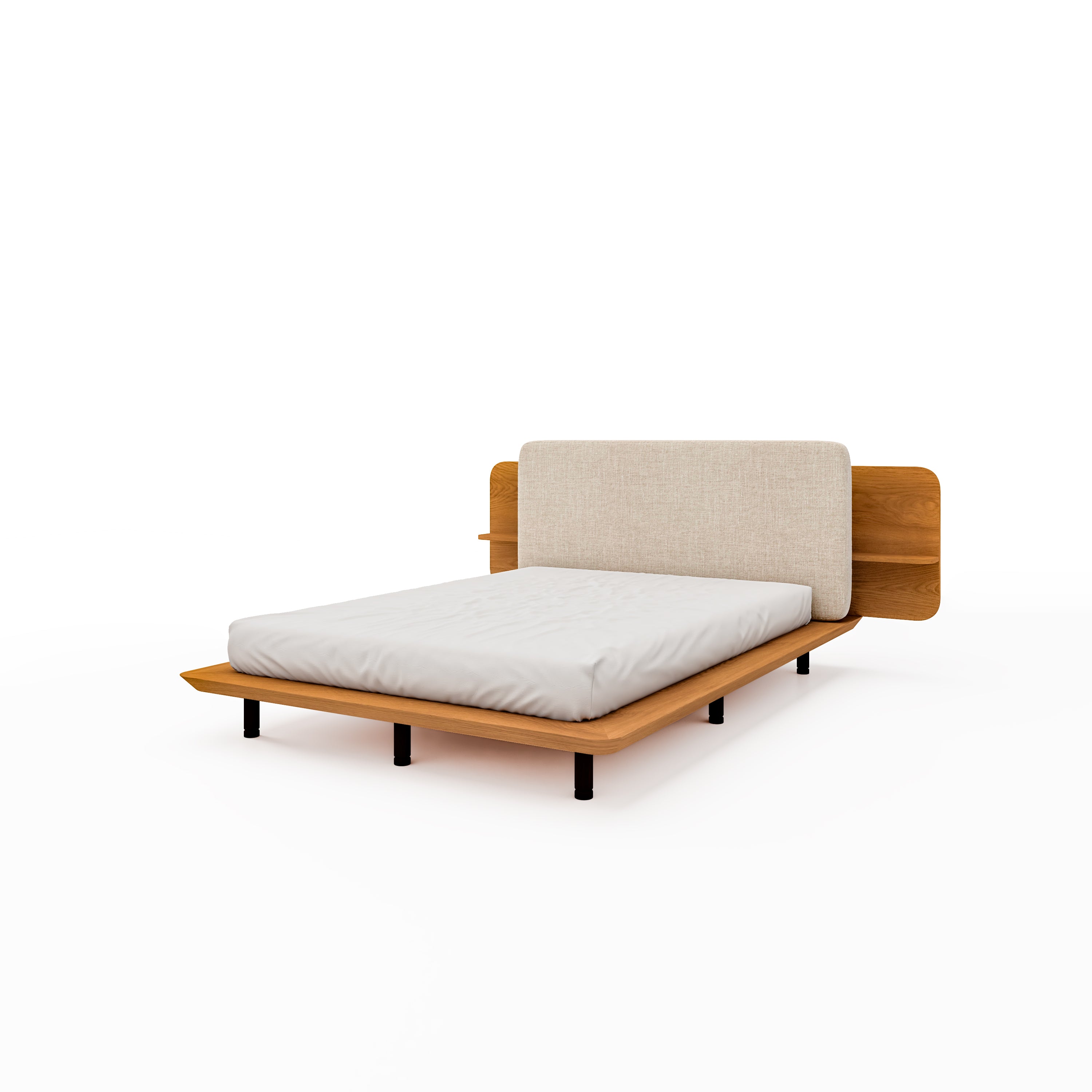 Discover the perfect fusion of style and function with Zen, a bed showcasing a wooden and textile headboard, complete with convenient side shelves for your personal Items.